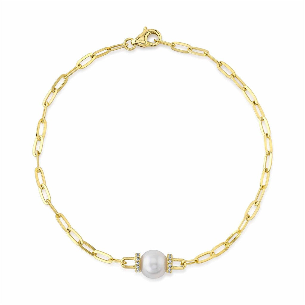 0.07CT 14K Y/G DIAMOND & CULTURED PEARL PAPER CLIP LINK BRACELET