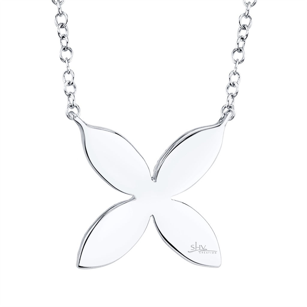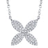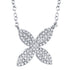 14 karat white gold diamond flower necklace pave set with 0.20 carats total weight of small round brilliant cut diamonds on the four-petal flower shaped necklace center