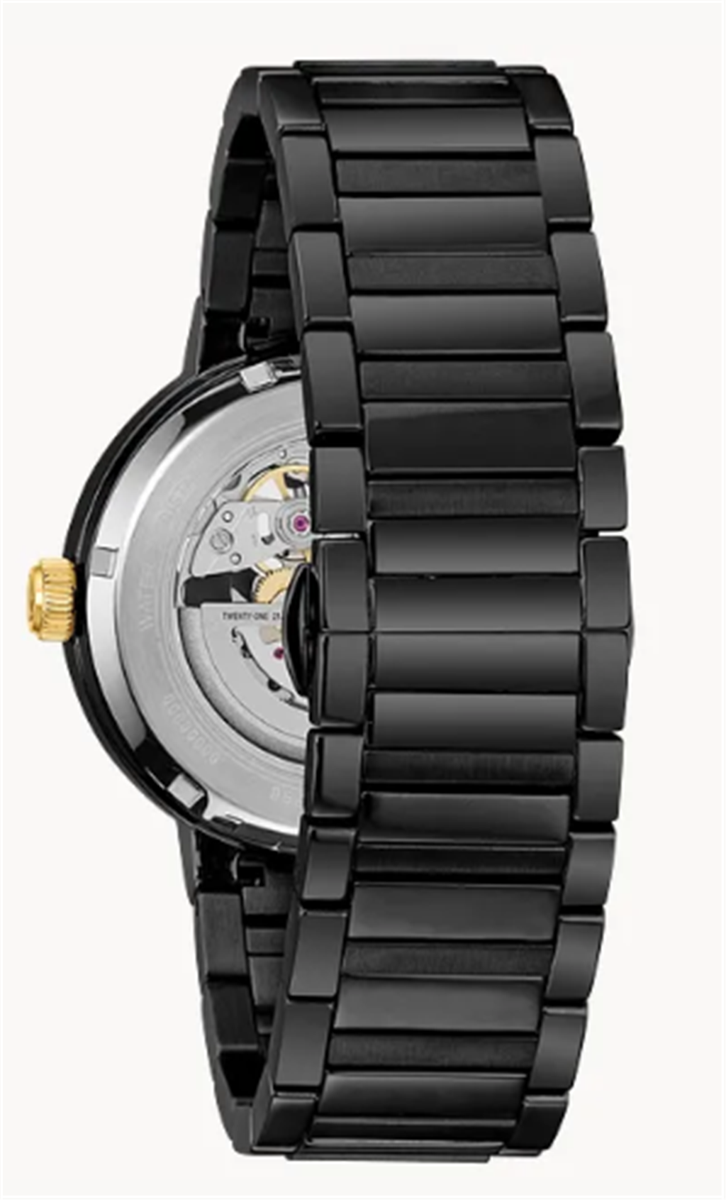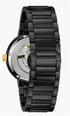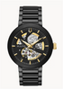 Futuro Modern. In black IP stainless steel, automatic self-winding movement with 40-hour power reserve and open aperture black dial with gold-tone accents, domed mineral glass, screw-back case, black IP stainless steel bracelet with double-press deployment closure.