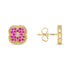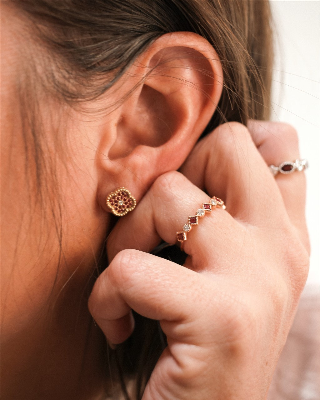 14KY .02TCW DIAMOND AND .29TCW RUBY PAVE CLOVER STUD EARRINGS WITH MILGRAIN BORDER