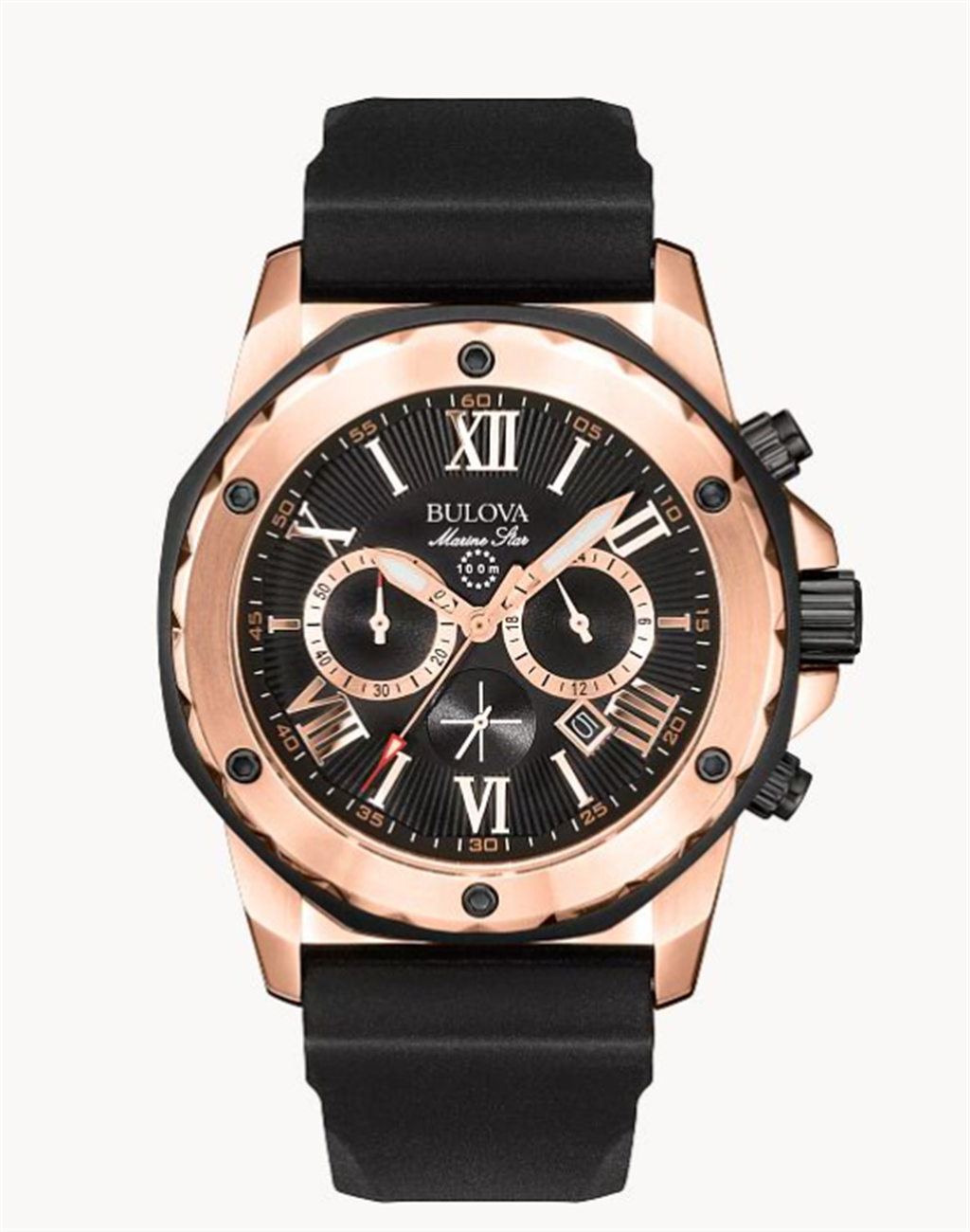 From the Marine Star Collection. High-performance chronograph in stainless steel with black and rose-gold ion-plated finish, black patterned dial, luminous hands, calendar, second hand, mineral crystal, screw-back, and black rubber strap.